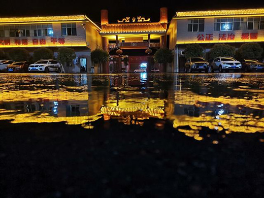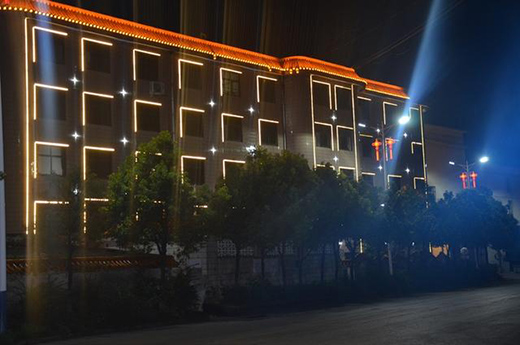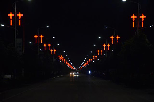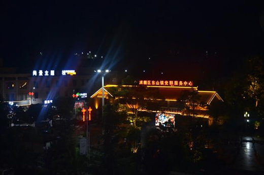 远眺整个东山集镇,红色的路灯串成了一条硕大的红色“项链”,蔚为壮观,一些高大、标志性建筑上的灯条彩带简约地勾勒出了建筑的轮廓及整个集镇的风貌,夜晚灯光的点缀让东山俨然成了一件立体浮雕工艺品。