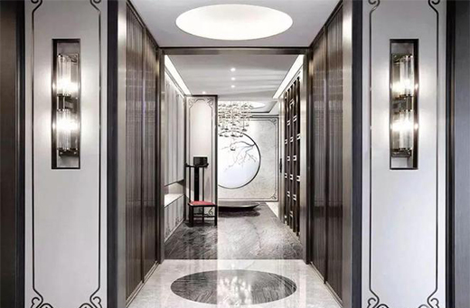 这种玄关多是狭长的,狭长的过道,恰好将两个独立区域一分为二,对于这种类型的玄关,设计师一般都会建议业主在一面墙,做大量柜子,包含衣帽柜、储藏柜,另一面墙可以做些艺术装饰。