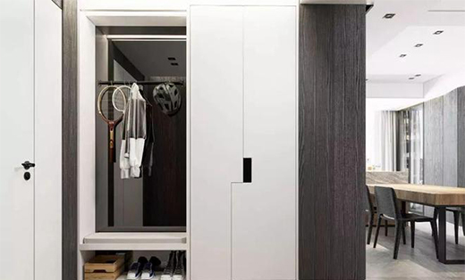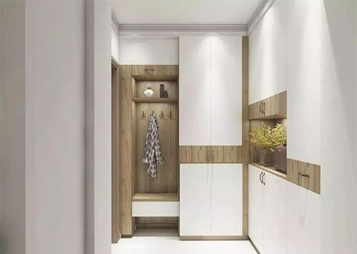 如下图所见,这种玄关一般呈小型的门厅形状,即进门后需90度转身,才能进入室内空间,对这种类型的玄关,在设计的时候都会充分利用门后空间。