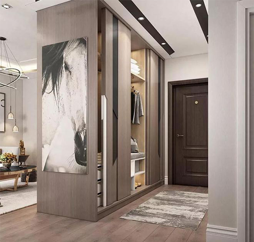 这种情况在小户型是最常见的,为了避免一览无余的尴尬感,很多屋主都会选择设计一个,垂直于墙面的隔断柜,来进行视线的阻隔,考虑到实用功能,建议鞋柜可以做通顶设计。