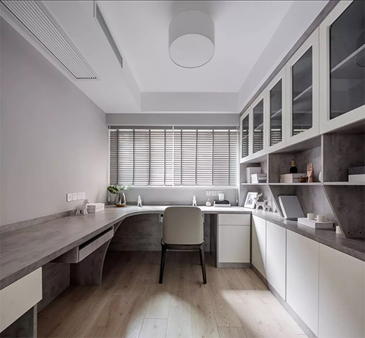 三、定制柜与书桌交错在定制全铝收纳柜的末端,交错地装上全铝书桌,这样让空间的利用更加透彻,最大化地实现收纳与办公的空间。
