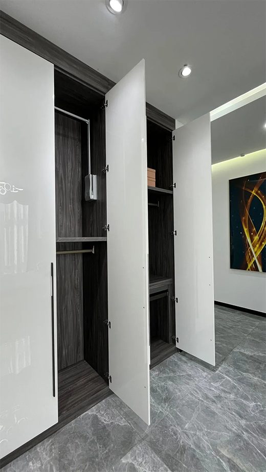 铝板单块尺寸可以达到1.22*2.44M,最高可以做到3M,满足基本户型和挑高户型的需求,板材无需拼接,一门到顶,更加美观。铝板质量轻、刚度大,门板背面无需拉直器,轻奢极简、方便耐用。