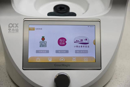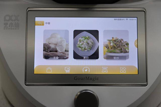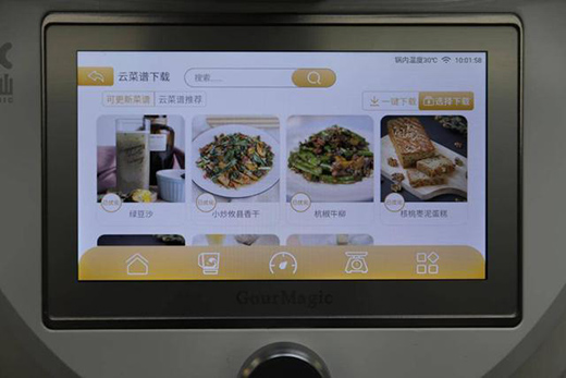 在使用方面其实更多的是通过这块7英寸高清触摸屏幕进行,对比同类产品来说,除了显示屏尺寸更大外,更大的区别笔者认为是在人机交互方面,整体UI界面的设计较为扁平化,内容分类清晰直观,上手门槛低,按照笔者体验来说,无需任何烹饪经验的人,都能很好的操作这款设备。UI界面主要分为主页的菜谱烹饪;第二类清洗类,包括机身自洗和生鲜蔬果类的清洗;第二类是烹饪台,用于手动调节转速、温度,时间;第四类则是称重功能,对于烹饪方面,除了菜谱烹饪外,对于各种食材、配料的拿捏也做到量化的标准,这点尤为重要、;最后就是常用功能了,比如豆浆模式、揉面模式、蒸汽模式等。