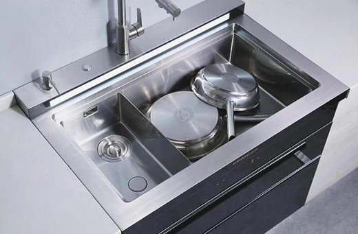 其次,为了尽可能减少厨电产品的占用空间,必须选择高度集成化的产品。例如金帝旗下的集成灶产品,将油烟机、燃气灶、蒸烤箱集于一身,实现了多种烹饪功能,实际占用空间还不足一平,并且多样的功能也确定了其烹饪中心的位置;集成水槽,则是将水槽与洗碗机相结合,充分利用水槽下空间,打造出全新的厨房洗涤中心。