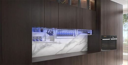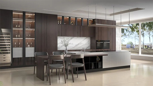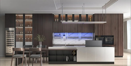 靠墙面柜体内嵌冰箱、红酒柜、蒸烤箱,内在设计抽屉、多功能拉篮、动感升降吊柜、玻璃柜等,收纳与展示相结合,实现空间的层次感。
