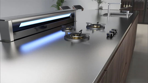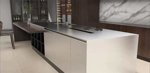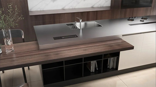转身便是超长岛台,高低错落,台面、水槽、燃气装置集成一体,无缝对接;电动翻转插座、电动升降烟机隐藏其中,将极简风格发挥的淋漓尽致。
