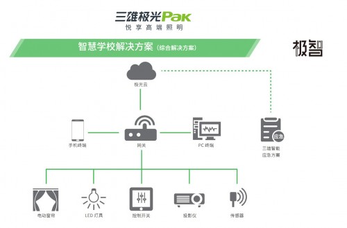 迎合时下智慧学校的发展趋势,三雄极光已推出智慧校园整体解决方案,可以通过将互联网设备连上云端,从而实现对校园环境进行整体智能化管控,有效提高校园的管理系统。