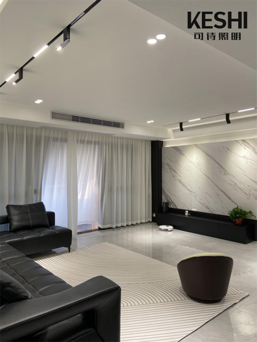 宽敞的大客厅,采用8盏6W的防眩射灯提供基础照明,既能局部分散照明区域,又确保空间整体的明亮感。再采用平行布局的两排磁吸轨道灯作补充照明,其中折叠款磁吸轨道射灯指哪亮哪,用其打亮沙发背景墙及电视背景墙,能让室内照明更具层次感。另外,双边灯槽吊顶搭配上明装暗藏式灯带,很好地营造出情调感满满的客厅氛围。这个宽敞又明亮的大客厅,真是整个家的高档大气担当。