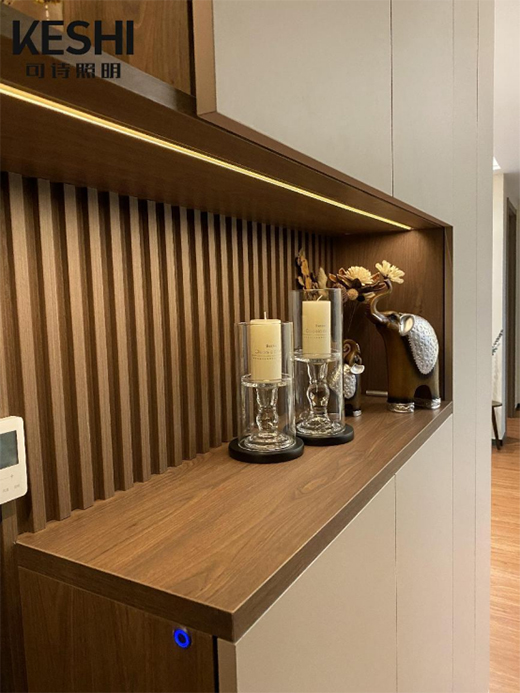 玄关柜安装了感应柜灯,采用的是触摸开关,使用起来更便捷。有了线条灯的点缀,整个柜子的造型感更强,让玄关也能成为一道令人瞩目的风景线,且线条灯的延伸也让人觉得玄关变得更为宽敞绵长起来,从视觉上看,空间延伸感更强。