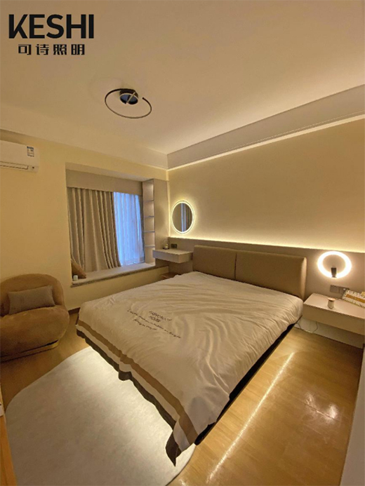 主卧中最让人惊喜的,一定是床底感应灯,只要一有人靠近,感应灯便会自动亮起,照亮脚下,这样主人在夜间起床也不用担心会找不到拖鞋或有摔倒的风险了。而床头背景板与客厅背景板有异曲同工之妙,无需特别的装饰,只需运用上线条灯便能达到简约但并不简单的光影效果。难怪专家说,“光是第四建材”。