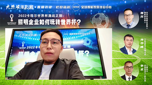 当天下午,芯龙光电联合创始人、国际部负责人魏民,木林森股份品牌总监孙少峰,三雄极光品牌管理中心副总监李全以线上连线的形式空降大照明直播间,大照明全平台联席总裁唐斌担纲主持,一同畅聊“照明企业如何玩转世界杯?”。