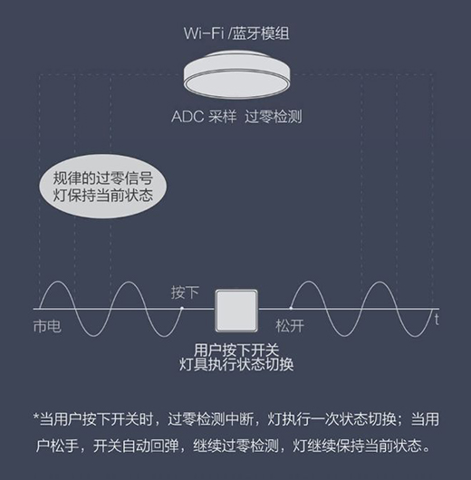 凌动开关是在普通开关的基础,加装回弹模块。可以保持智能灯是持续通电在线状态,进而实现语音、app控制及开关控制。