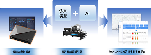美的智能诊断解决方案由“智能诊断引擎”和“云边协同应用方式”共同组成。智能诊断引擎中采用“仿真模型+AI算法”的方法,融合售后专家、运维专家、制冷专家多年经验,实现了性能检测、故障预警等功能。“云边协同”指的是智能诊断引擎已经接入iBUILDING美的楼宇数字化平台以及智能边缘设备,兼顾有网及无网条件。
