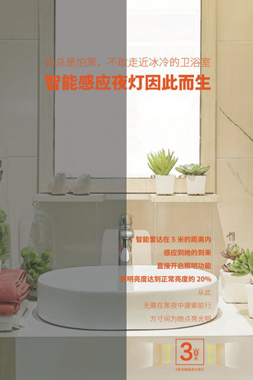 每当主人夜间来到卫浴的时候,她总是怕黑,不敢走近冰冷的卫浴室,智能感应夜灯因此而生。