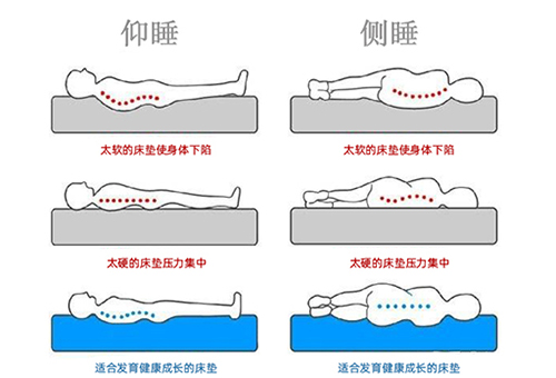 但是太软的床垫也不是好的选择。太软的床垫支撑性较差,躺着的时候凹陷很大,无论是仰卧还是侧卧,脊柱都会过度弯曲,轻则越睡越累,精神不济,重则导致脊椎变形。