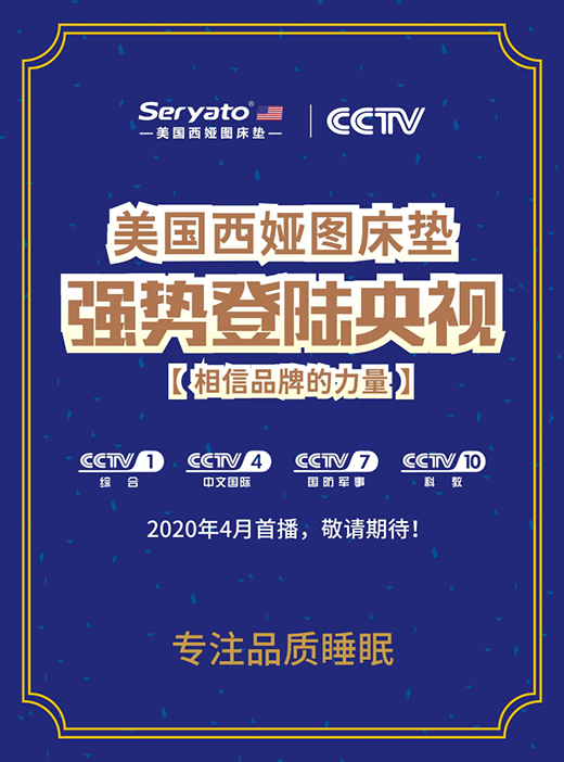 2020年4月29日,Seryato西娅图品牌将以国际视野开启品牌、产品全面升级的序幕,成功签约中国CCTV-1、CCTV-4、CCTV-7、CCTV-10频道,向全球消费者传递Seryato西娅图卓越的品牌价值。