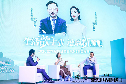 活动现场,张歆艺在充分体验和全面了解慕思M5防螨床垫后,与慕思总裁姚吉庆就睡眠环境除螨、健康等话题进行了深入交流。张歆艺分享了她对于睡眠的要求,一定要睡得好,才能保障好心情,人的整体状态才能活力十足。而好的睡眠,就应该用慕思M5床垫这样的好产品。