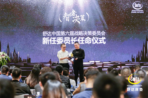 会议上选出了新一届舒达中国战略决策委员会委员,广州、南京、北京等16名经销商当选。广州经销商赵石磊担任新一任委员长,吴总向他赠送了一份新任委员长纪念品。
