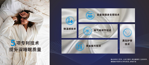 舒是通过对“睡眠微环境学”的深入研究,采用“微气候调节技术”,调控睡眠时人体湿度和温度,结合全球专利技术“能量簧翻身支撑系统”,推出新一代私人订制左右分区床垫,全面提高深度睡眠时长。标志着舒是率先建立了“5G深睡眠中国芯”技术体系。