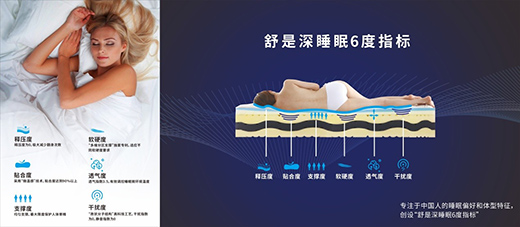 舒是突破多个技术难点,创设“舒是深睡眠6度指标”:支撑度、贴合度、软硬度、透气度、干扰度、释压度。