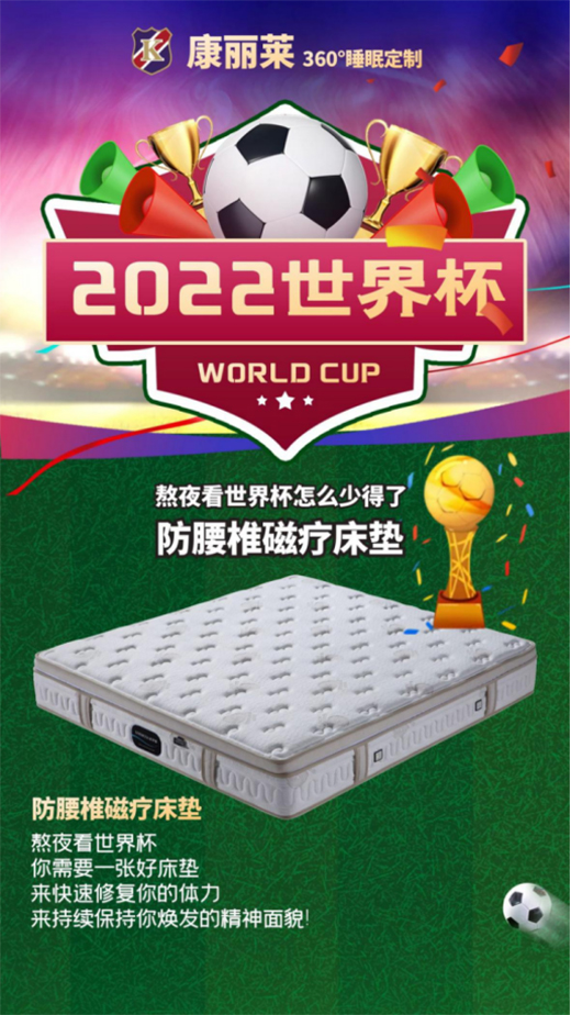 对于球迷来说,四年一度的世界杯是一场不折不扣的狂欢,而这一届世界杯更是意义非凡。无论是亿众球迷的初心——足坛巨星梅西C罗的“最后一舞”,亦作为点亮疫情阴霾下全球数亿人的希望之光,热爱足以战胜一切。康丽莱床垫以匠心履真心,以真心守初心,致力于打造极致舒适的睡眠体验,让您时刻以充沛精力保持着对生活的热爱。