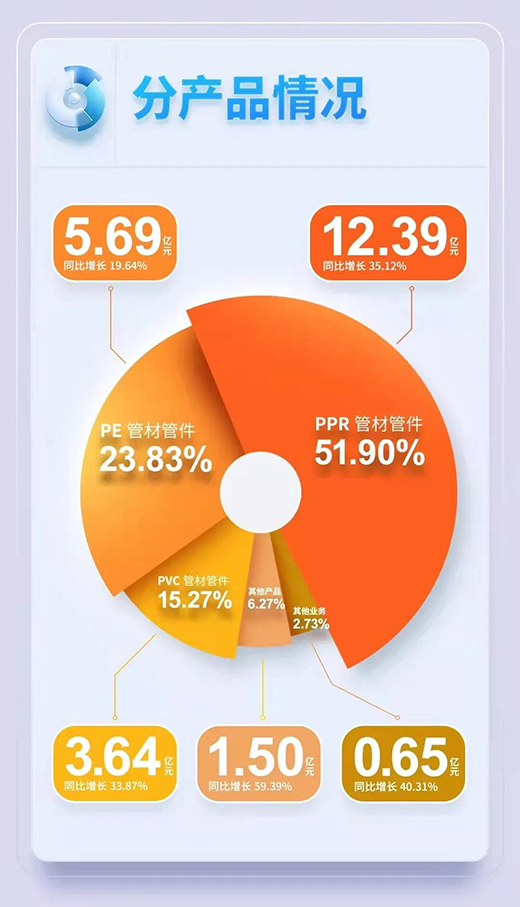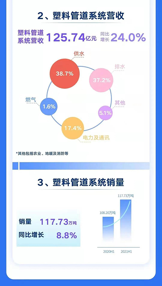 就品类而言,塑料管道、不锈钢管道等依然是核心品类。部分上市公司发布的数据显示,这两大品类的增长势头不减,以中国联塑为例,2021上半年,其塑料管道系统营收约125.74亿元,同比增长24%。伟星上半年的营收23.87亿元,其中,PPR管材管件占51.9%,PVC管材管件占15.27%,PE管材管件占23.83%,同比增长幅度在19%到35%左右。