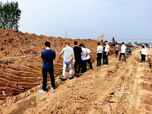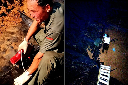 宏兴管业户外的防渗施工,不仅需要在阳光的直接曝晒下工作,还要在工作面的坑底进行作业。