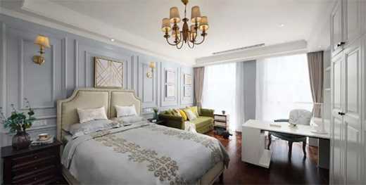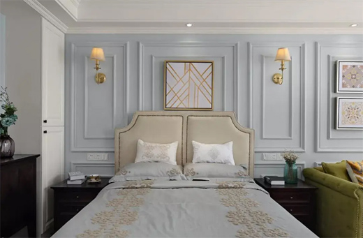 卧室整体的色调为淡蓝色,选用贝壳粉涂料,因为贝壳粉涂料的细腻质感非常适合喜欢追求完美的年轻人。床头背景墙选用的造型是经典的美式风格,用简约的线条打造高贵的气质。