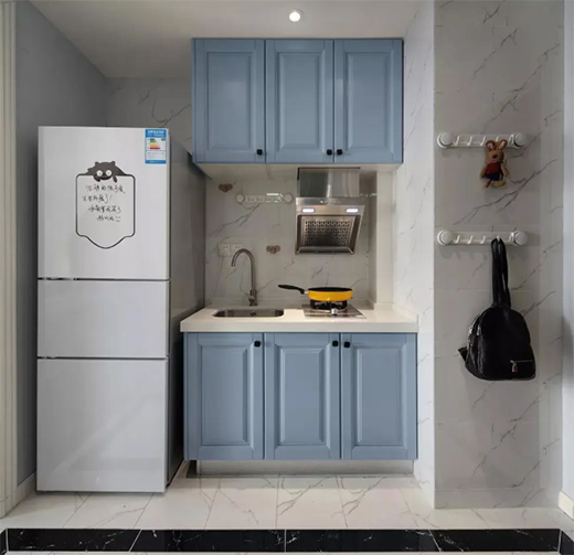 美式风格装修的单身公寓,仿佛自己的生活也变得高贵优雅起来。首先入户空间进行合理装修,设计成简约迷你的小厨房,麻雀虽小五脏却俱全,生活不能失去原本的烟火气息。橱柜的颜色选择的是青蓝色,也是为了和整体装修相互搭配,精致的青蓝色也深受年轻人的喜欢。