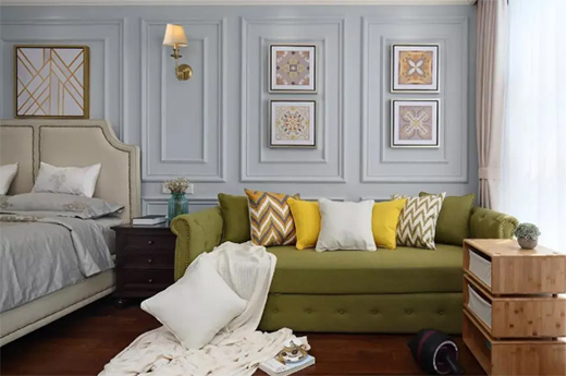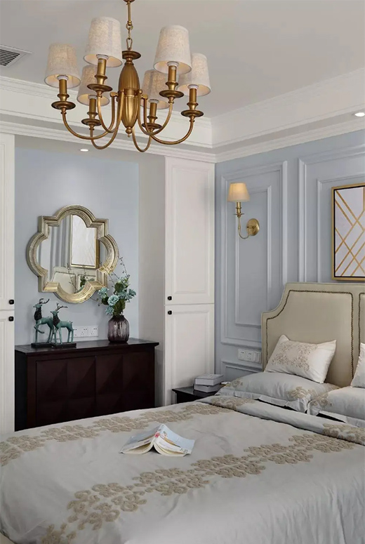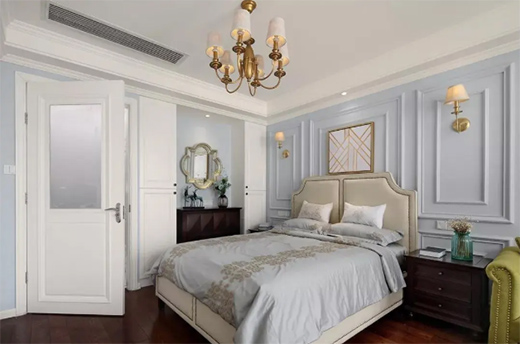 沙发背景墙也同样选用淡蓝色,和床头背景墙形成通透视觉效果,沙发背景墙同样采用一样的美式风格的线条来装饰,空间既不会显得局促,同时也可以很好的区分功能区。