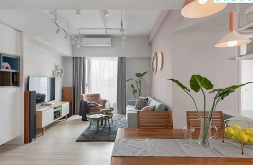 小户型也是十分适合打造浪漫氛围的户型,进入客厅我们看到的仍然是北欧风的简约气质,在这里我们看到浪漫与简约毫不冲突。客厅沙发背景墙选择用贝壳粉藕粉色进行装饰,贝壳粉细腻的质感让整个装修看起来更加高级。