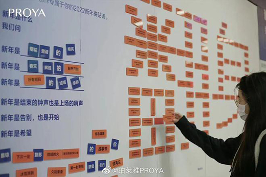 在珀莱雅看来,公众参与对作品的诠释、改造、甚至再创造,其实也是作品的重要部分。为了能让大众在展览中获得停顿与思考,珀莱雅把地铁站的静态广告变成互动广告牌,从参展诗人的诗歌中提取了一些关键词,邀请大众自由排列组合,创作属于自己的2022年新年拼贴诗,让诗歌引领新一年的自己。