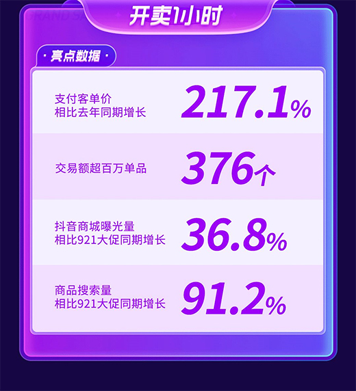 本次抖音双11好物节主打抖音商城阵地,站内大促氛围火爆。仅开卖1小时,支付客单价相比去年同期增长217.1%;抖音商城曝光量相比921大促同期增长36.8%;商品搜索量相比921大促同期增长91.2%。