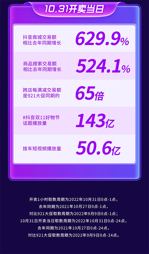 从货架场景、内容场景到支付端财经玩法,抖音电商全域玩法全面开启,截至10月31日24时,抖音商城交易额相比去年同期增长629.9% ;#抖音双11好物节 话题播放量达143亿。