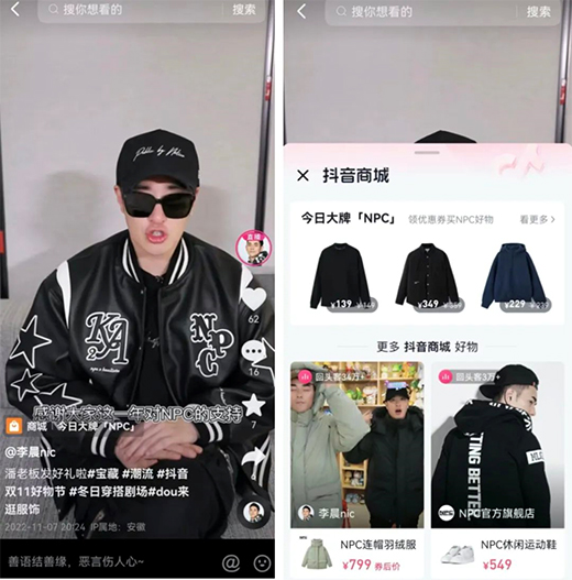 潘玮柏与李晨nic携手创立的服饰品牌NPC在双11以亮眼的销售成绩,成为服饰品类的标杆。在双11爆发前,NPC联手潮鞋品牌Kaalixto推出联名新品,并举办线下快闪店为新品发售预热。双11活动中,NPC挖掘特色短视频和直播玩法,明星直播间与品牌直播间共振,并通过短视频锚点引流商城,实现了全域联动。数据显示,11月7日单日NPC品牌总支付近2000万,泛商城支付达近400万,其中抖音商城成交近200万,爆发系数高达6倍之多。