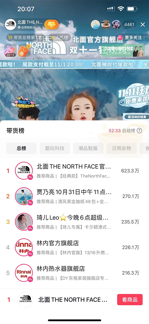 户外品牌北面双11期间开启户外直播,通过露营、运动等户外场景的知识科普,引发用户对户外服饰品类的广泛讨论和关注,多次荣登带货小时榜首榜、预售品牌榜第一以及商品榜第一。