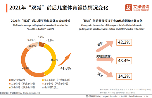 据艾媒咨询调研数据显示,“双减”后,超过半数的儿童(56.0%)平均每天锻炼时长能够达到1小时以上,父母带孩子参加体育活动的次数也明显增多(42.3%)。数据还显示,在双减后参与跑步、羽毛球、足球、篮球等传统项目人数明显增加。
