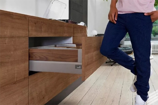 家具使用过程中,要尽量保证静音、顺滑、开启力小。我们的建议是多用隐藏式滑轨、多用移门的开启方式。