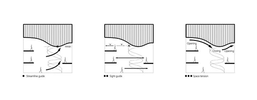 建筑的参观动线为:入口——螺旋楼梯——屋顶——展厅——连廊——地面,这一路径形成了连续闭环,访客得以充分参观体验室内的空间效果。