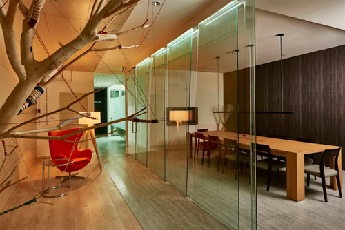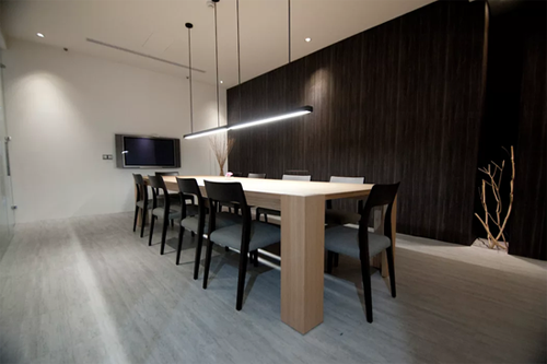 呼应著德制工艺对于音质的极尽挑剔,在品牌办公空间内,设计师在大基底部分选以简洁的线条为笔,透过光带折射,利落且精准地划定场域的分界关系;且为让北欧般的无压生活深植入工作场景,空间一隅俏皮选以童话故事中,带有魔力的豌豆为主角、开枝出小树形体,让超现实的地景变身为空间风景,展现出截然不同的办公想像。