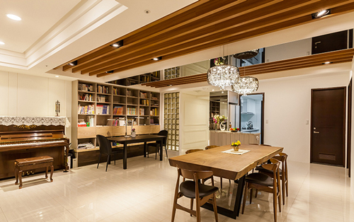 餐厅空间墙面承接电视墙的大理石,延续气派感,天花板上方的大横梁,运用灰镜加木纹格栅设计,横向的沟缝带动视觉上的延展,巧妙的使梁成为造型的一部分,设计师扩大感的设计,使空间更具有独特魅力,吸睛度百分百。