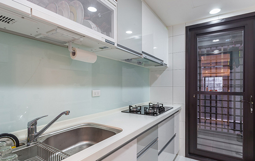 设计师利用不同折射材质,使空间拥有更多不同表情。一踏进玄关处,为加深客人的印象,运用纯白色系加上古典线板,鞋柜使用百页门片,不但符合风格又可以让鞋子透气,底部留空后衬灯光技巧,让量体更轻盈化;另一面墙加上穿衣镜,方便外出整理仪容,又能放大整个玄关空间,走道尽头以大片茶色玻璃砖装饰,透过灯光的折射,展现水波纹曲面线条,酝酿朦胧绝美光影。