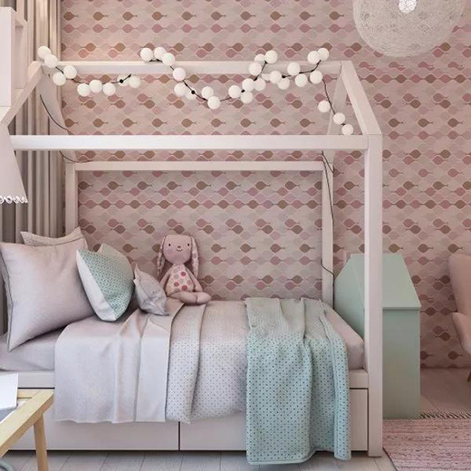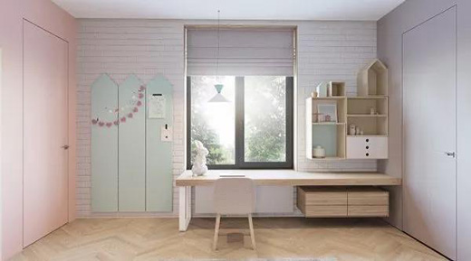 一个简约实用的有爱空间,房间不大,但每一处可利用的空间都落实到位。长条的边几既可以当作置物台又可以当作储物空间,连装饰的小屋也摇身一变小小书屋,一体的衣柜里间开一格收藏着孩子们的心爱之物,实在精致用心。装饰的挂画同样是无不体现小主人的日常喜爱。