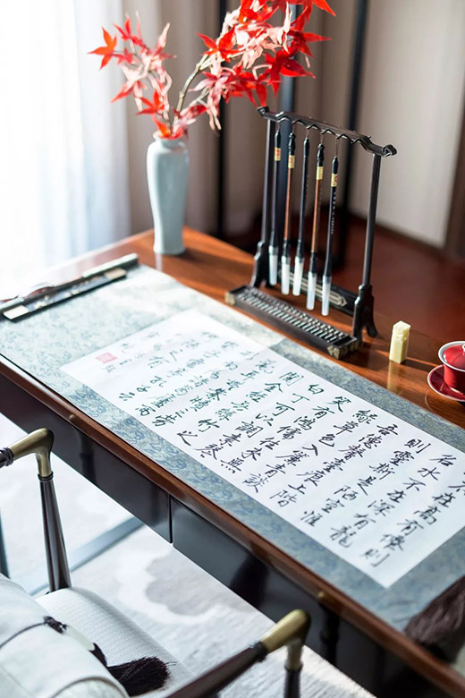 中式风格的空间,自然流露出一种经久不息的古典气质,以高洁素雅为尚。在书法室的呈现中,清贵之气与书卷气交融。“不要人夸颜色好,只留清气满乾坤,”元代诗人王冕的诗句,洋溢着磊落浩然之气,也凝炼在这个空间中。