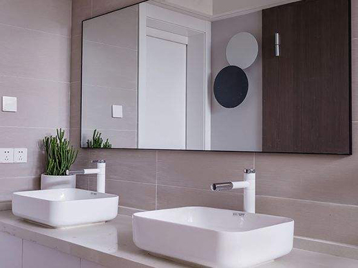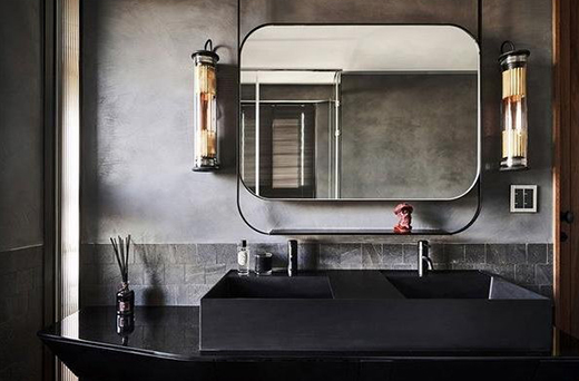 小空间中镜子是一种利器,将墙面布置成一整面的镜子,原本狭小的空间也变得通畅起来。而对于单纯满足洗漱或是简单的洗涤功能的水池来说,并没有必要做的很深,或许一个斜面就能够解决问题。