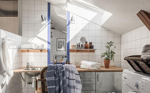 卫生间的墙面大多会采用瓷砖,而对于一个小空间来说,白瓷砖就是扩大空间的神器了。坡顶上的天窗引入阳光,明亮的光线将白色的墙壁白色的天花照的发亮,原本狭小低矮的空间显得开阔了不少。
