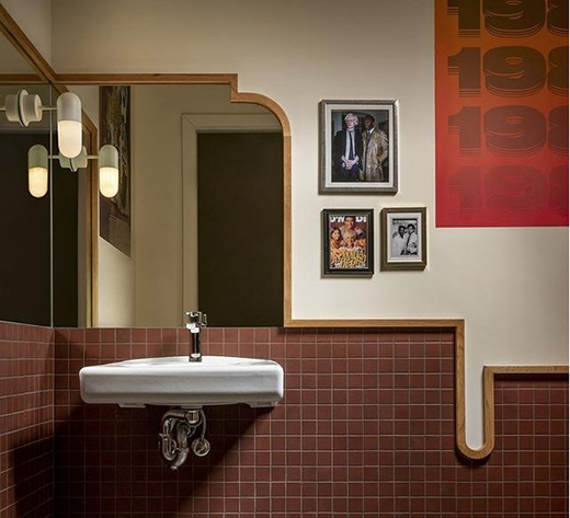 彩色的瓷砖自然也不少见,尤其是一些灰色调的瓷砖,能够带来浓浓的复古风情。镜子角上曲线的收边,墙上贴着的复古海报,老式的台盆式样,仿佛时光倒流回了上个世纪,但各个细节上又更加的精致和讲究。