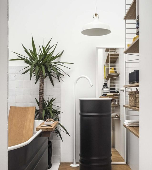 而这种犹如一个油桶的洗手池也为整体带来工业气氛,凌空放置,又显得轻盈而神秘。而下图的水池则与浴缸采用了一致的外观,几条勒脚显得精致而又层次。