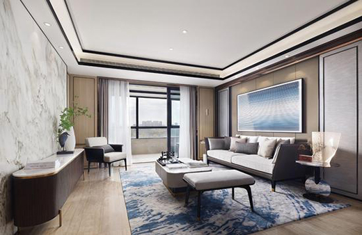 设计师运用湖光蓝调,呼应自然的妙笔,点染客厅空间的清新气质。由浓转淡的蓝色艺术画,与仿佛清波漾开的水纹地毯气质相映,搭配雅灰沙发、木艺软包、大理石背景墙,点缀以新型材质的极简灯饰,空间风韵简中有雅。宽阔的阳台,带给人观景的辽远视野与自然尺度,在这里,宜沏上一杯清茶,赏景悦心。