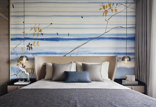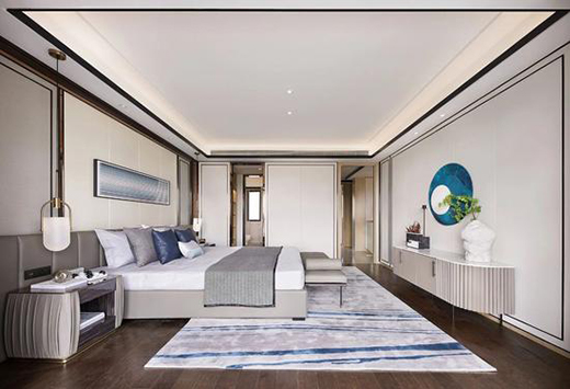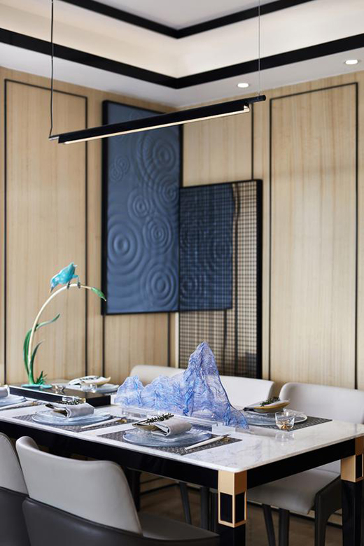 设计师赋予空间素净简雅的整体格调,以凝练的笔法抒写空间意蕴,将蓝与白的设色抽象化,写意湖天一色的自然胜景,又添画几笔干枝与树叶,呼应满室清秀的艺术气息。